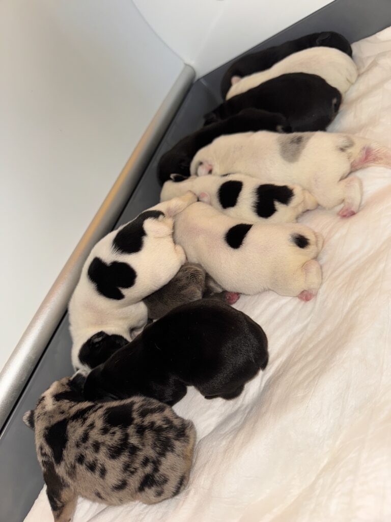 All of our available little ones will officially be 12 weeks+ as of tomorrow, and they are fully ready to go home. Our French Bulldog babies have now successfully transitioned onto hard kibble and solid foods, and they’ve been maintaining this new diet now consistently for some time. With that foundation in place, we’re now entering the phase where training becomes our focus.