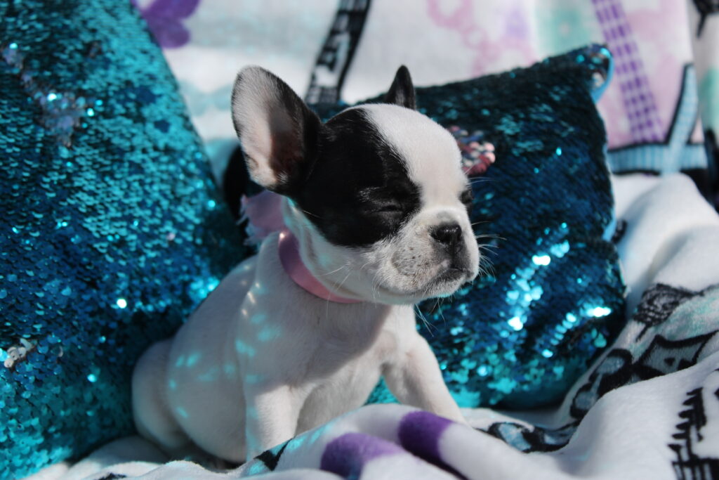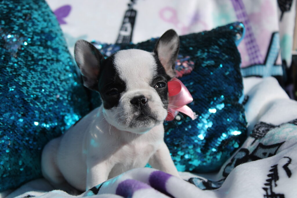 Miley is a black pied female from our Best of Both Worlds litter. This puppy features black markings covering both sides of her face, a small perfect black circle on her lower black, a small black bloop for a tail and currently has brown eyes. She will be ready to transition into her new home beginning 3/3/2026.